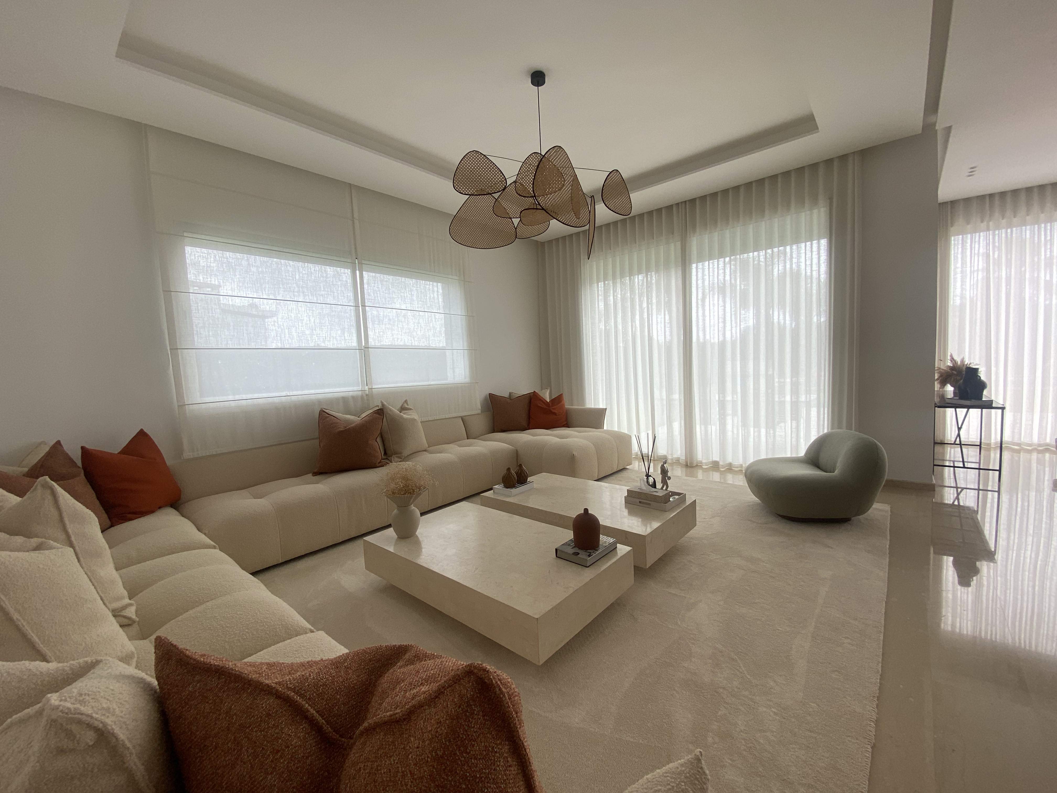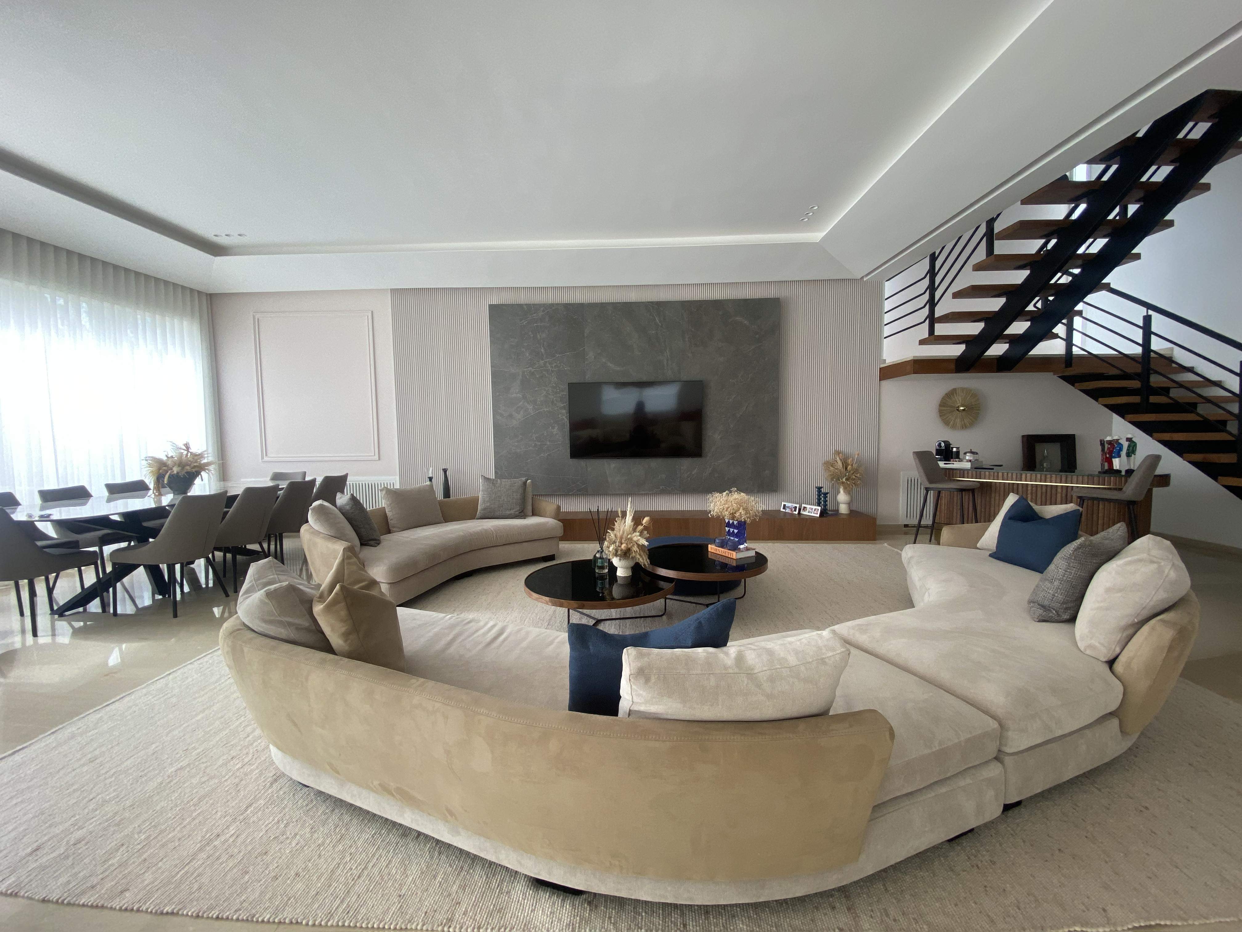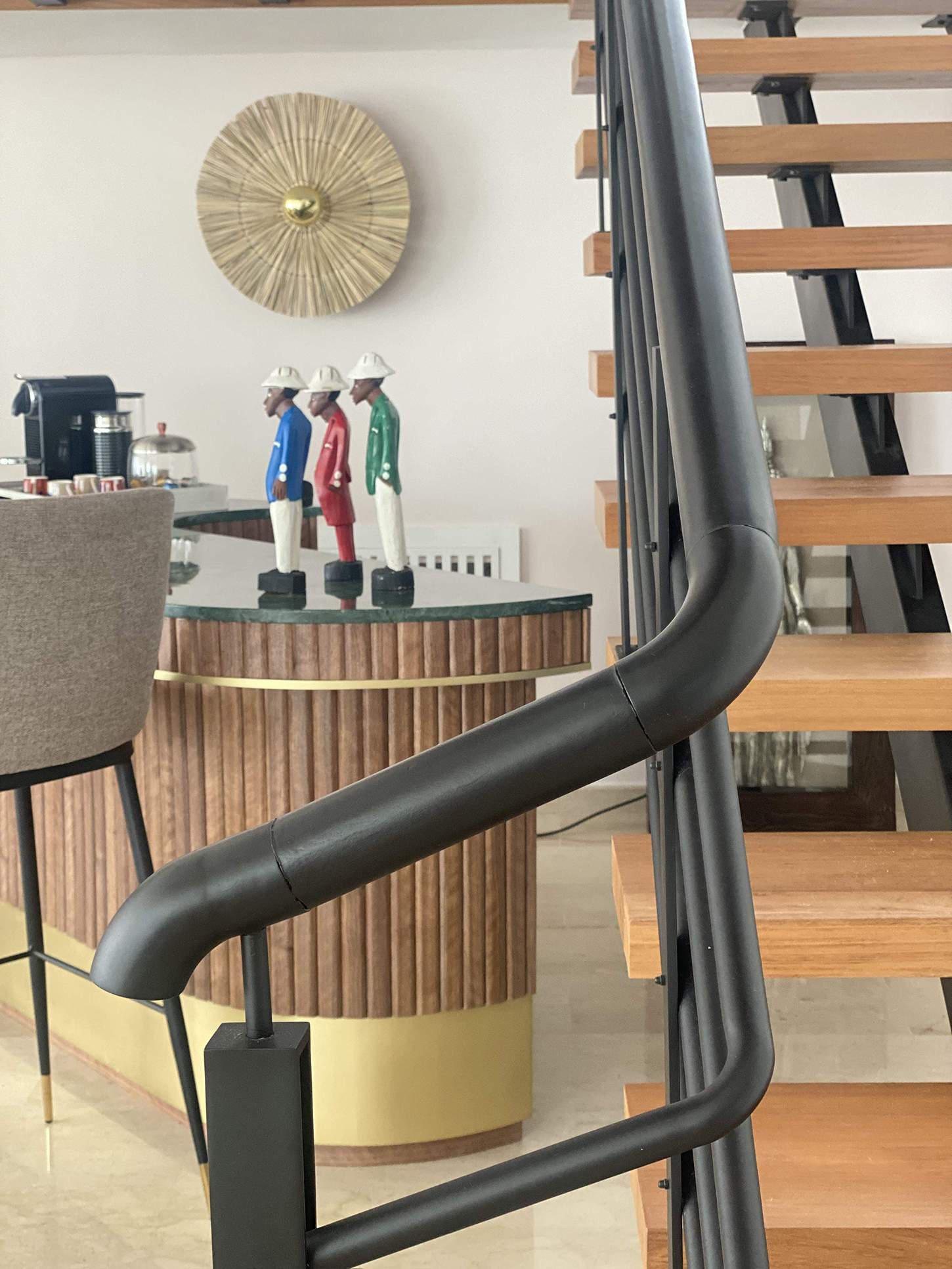 Une réflexion particulière a été menée au sein des différents espaces de la maison avec un jeu de matériaux, de couleurs, de matières et de lumière notamment à travers l’habillage mural, les escaliers, le mobilier et les éléments de décoration. Le tour formant ainsi un lieu lumineux, accueillant et apaisant.